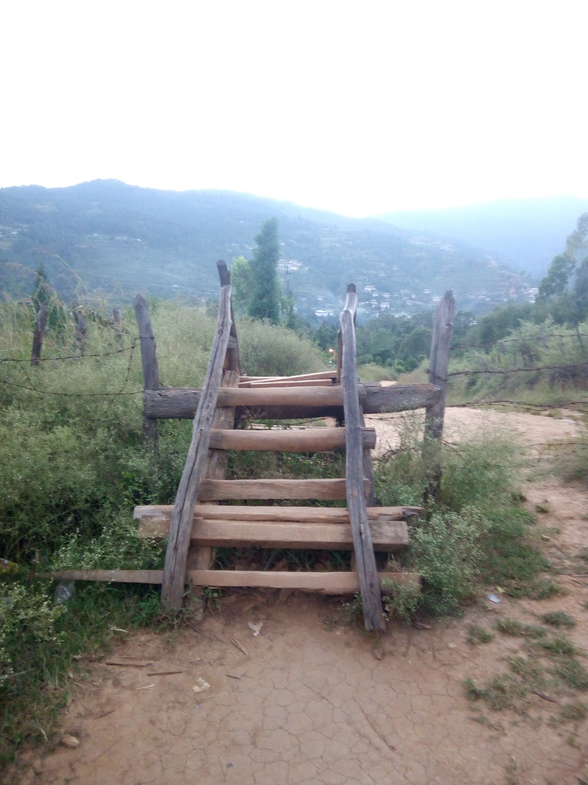झुलत्या पुलाकडच्या वाटेत एक कुंपण होते, आणि कुंपण ओलांडायला एक छोटीशी लाकडी शिडी.